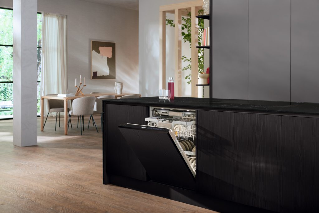 ノック2回でドアが自動的に開く、ハンドルレスのデザインを実現。丼や椀などさまざまな形状の食器を受け止める構造のバスケットで、無駄のない収納が可能。