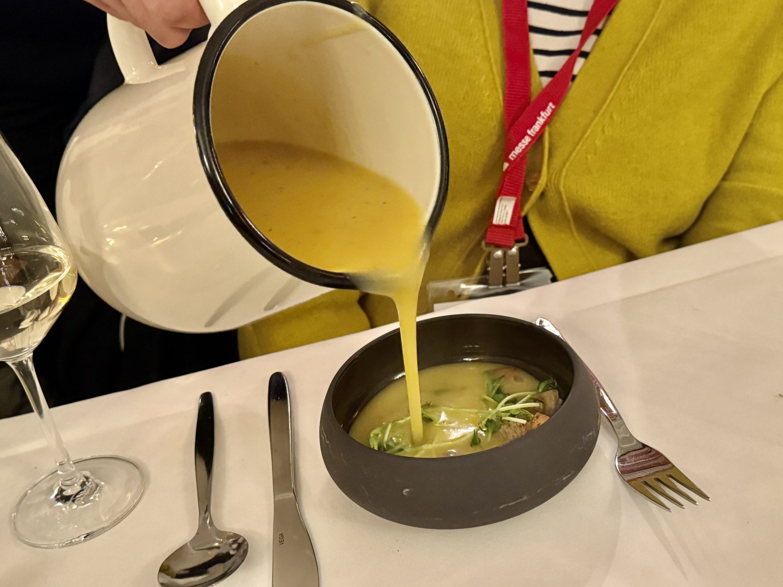 シェフがさっと合図すると、ホーローのポットを抱えたスタッフたちがきびきびと歩き出し、テーブルに近づく。事前に用意されたボウルにスープを注ぎ始めた。熱々のスープはポテトスープ。かすかにエスニックな香りがする以外は、かなり直球な「カルトッフェルズッペ(ポテトスープ)」。