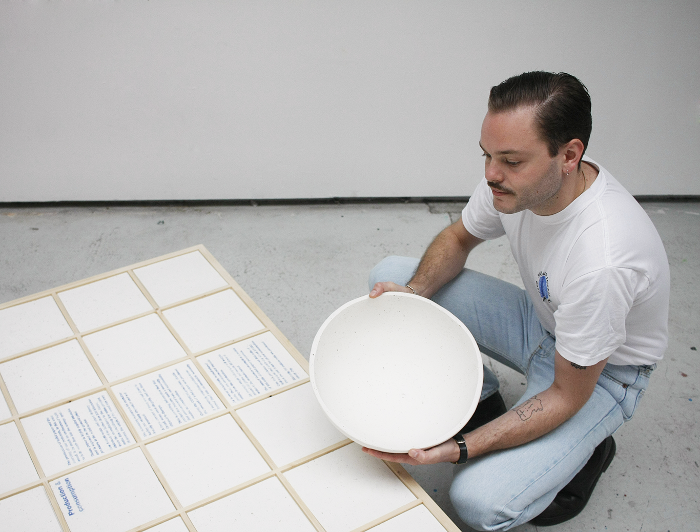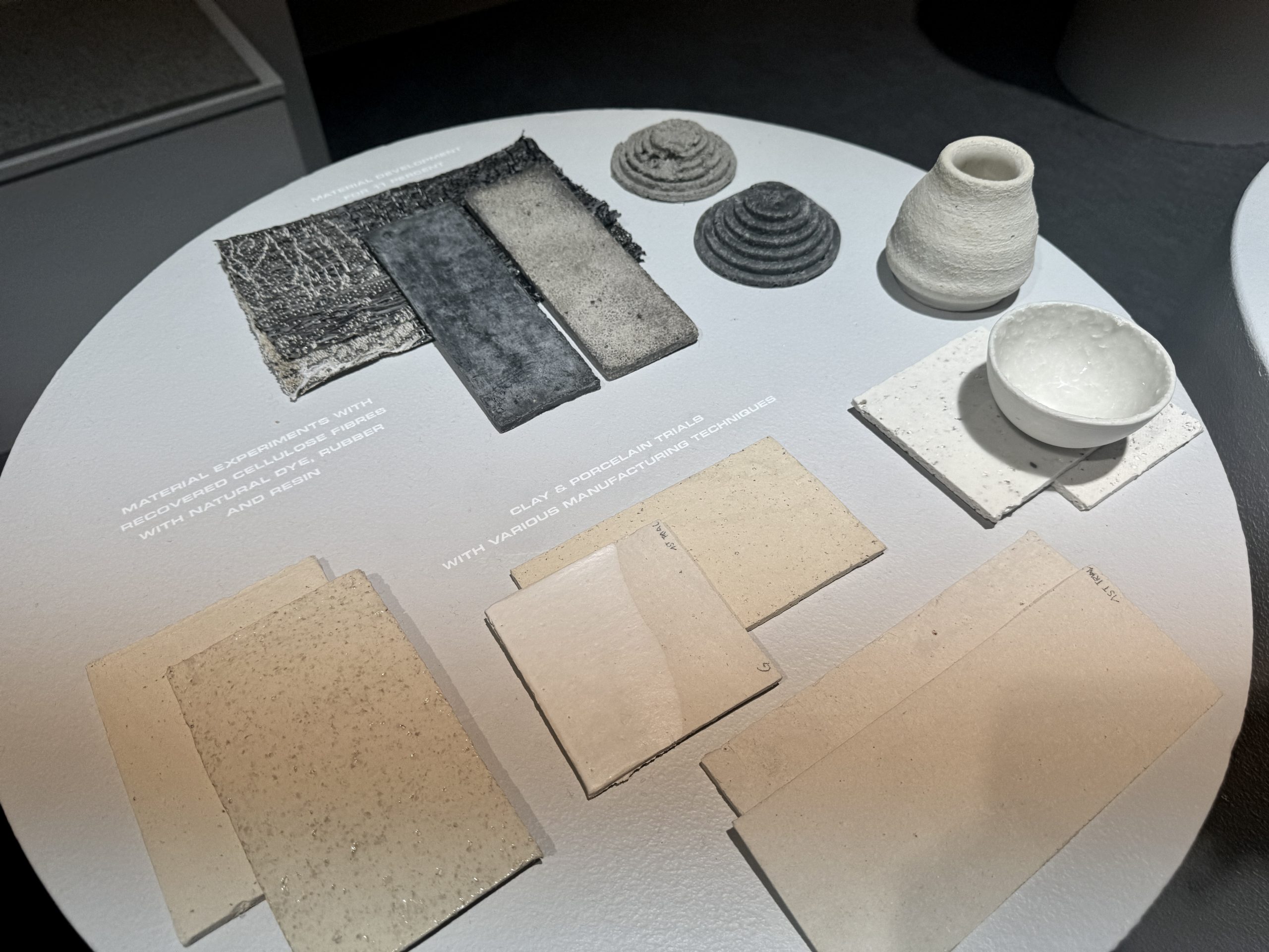 素材説明の展示を指して、「オランダに下水から使用済みのトイレットペーパーのセルロース繊維だけを組み上げて再生させる企業がある。その会社との共同プロジェクトなんだ。そのセルロースを基材に陶土をつくっているのがこの食器」