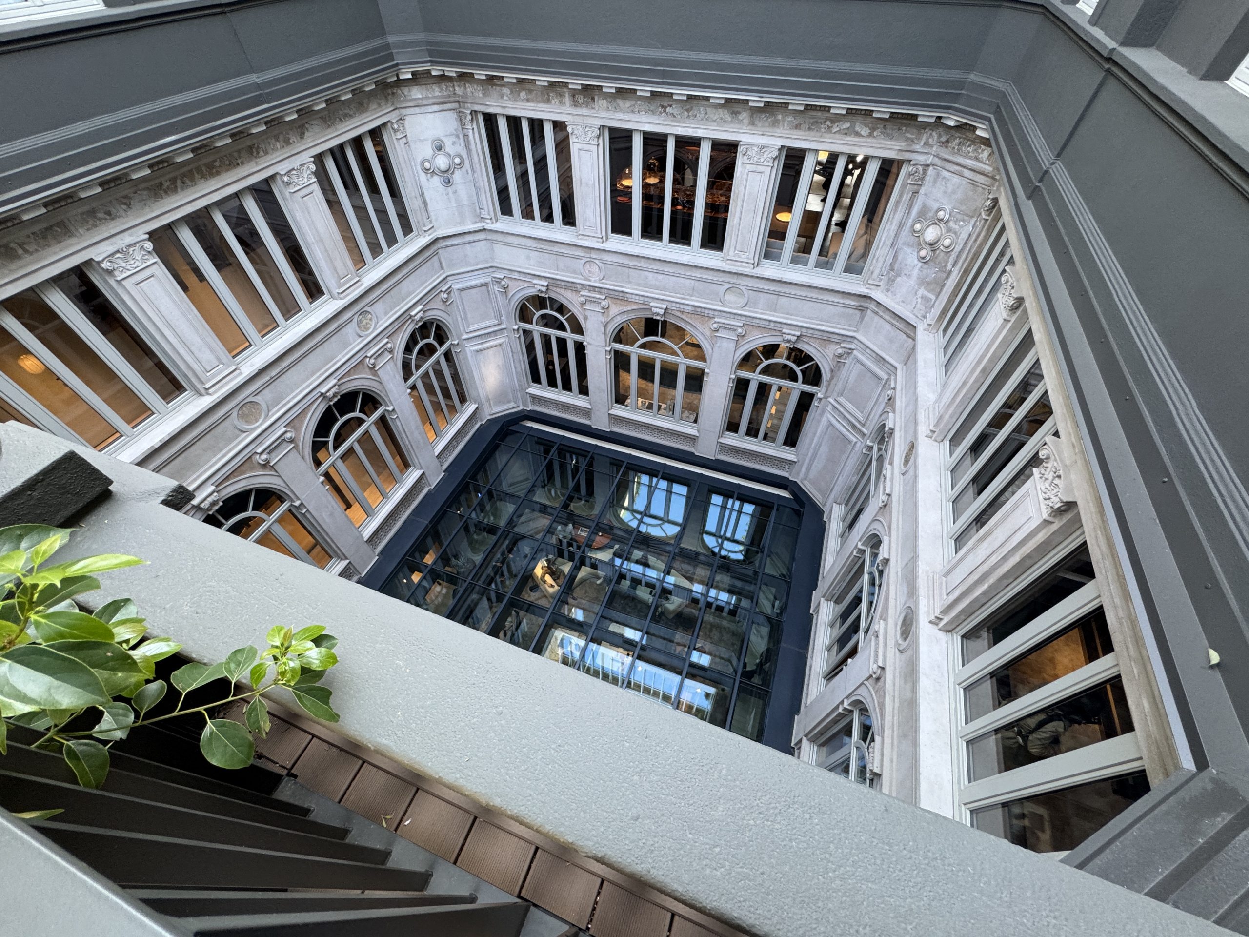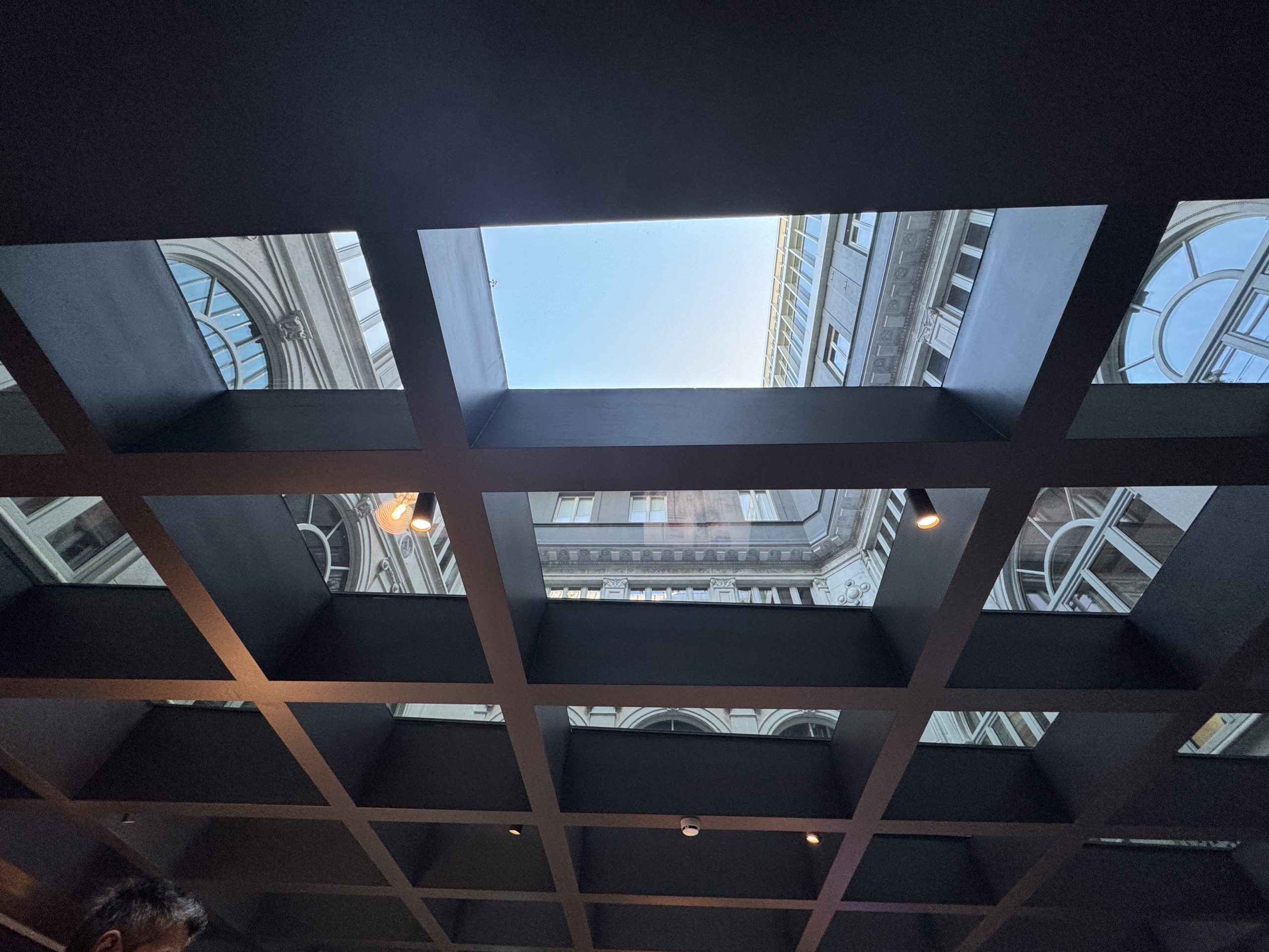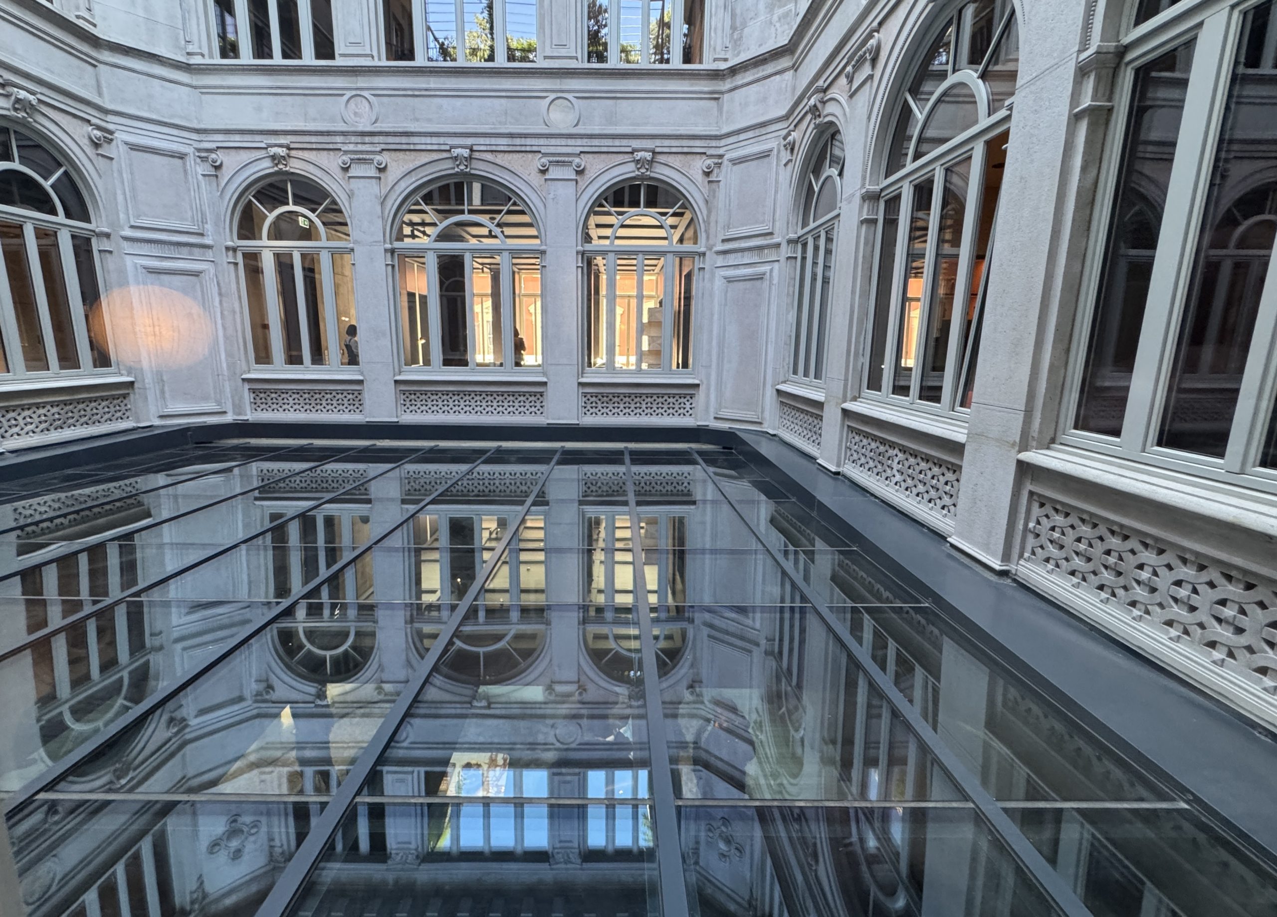 インナーコートのあるミラノらしい邸宅の中央にガラスの天井を設えている。19世紀後半に建てられた7階建ての建物は3000㎡の大邸宅。こんな建物気が付かなかった!以前はなんだったのだろう。