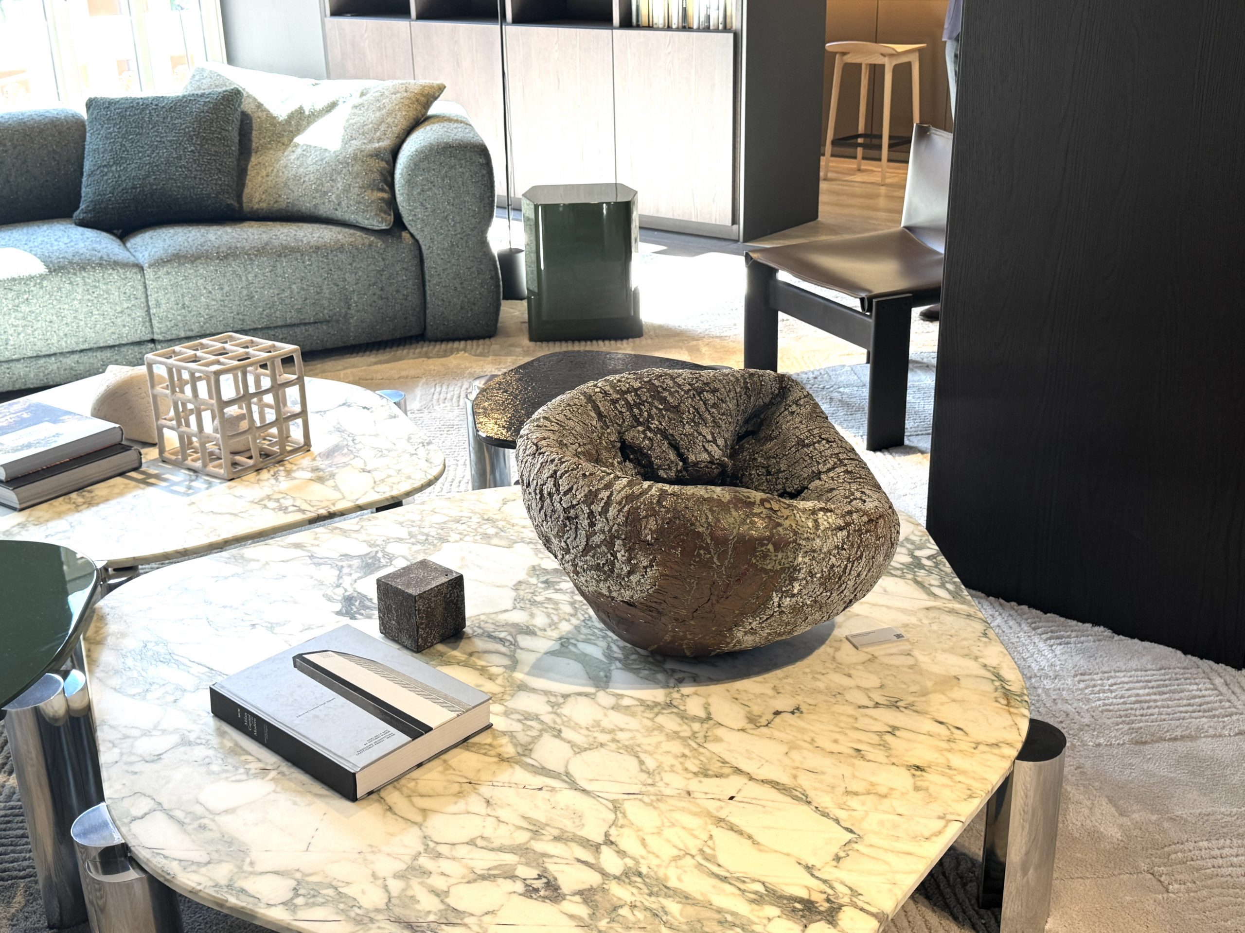 凛としたイメージの強いモルテーニ家具だけど、今年はフランス人の新デザイナー、クリストフ・デルクールを起用し、柔らかさ、変形、ガラスやメタルなどの艶感を加え、テクスチャーミックスの要素が強まっている。
