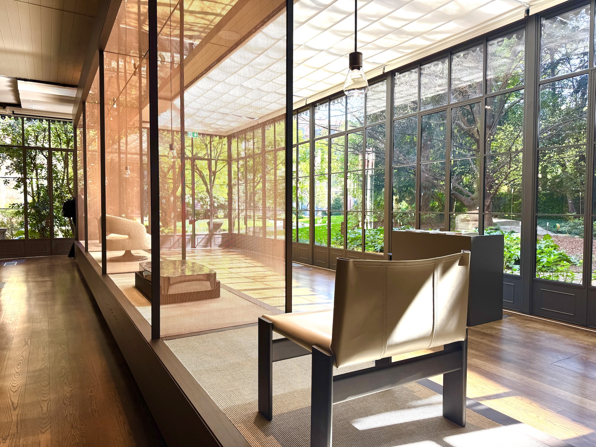 ガラスの天井の下では、外壁の一部が内装になるため(わかりますか?)、19世紀に設えられた石の壁がアートのように見える。時を経たものは、空間に深みを与え、モルテーニの家具がそういったものと似合うことも伝えている。