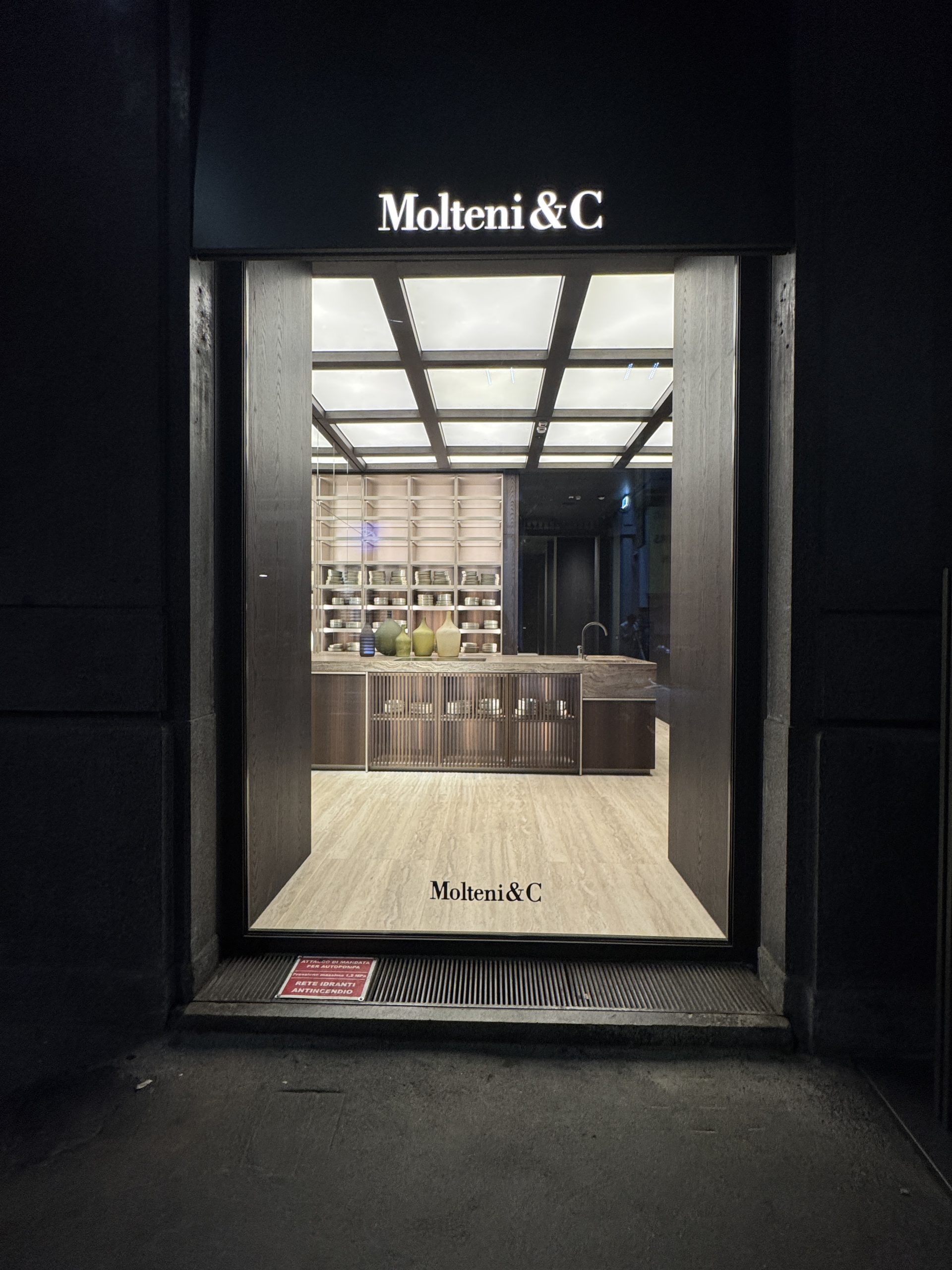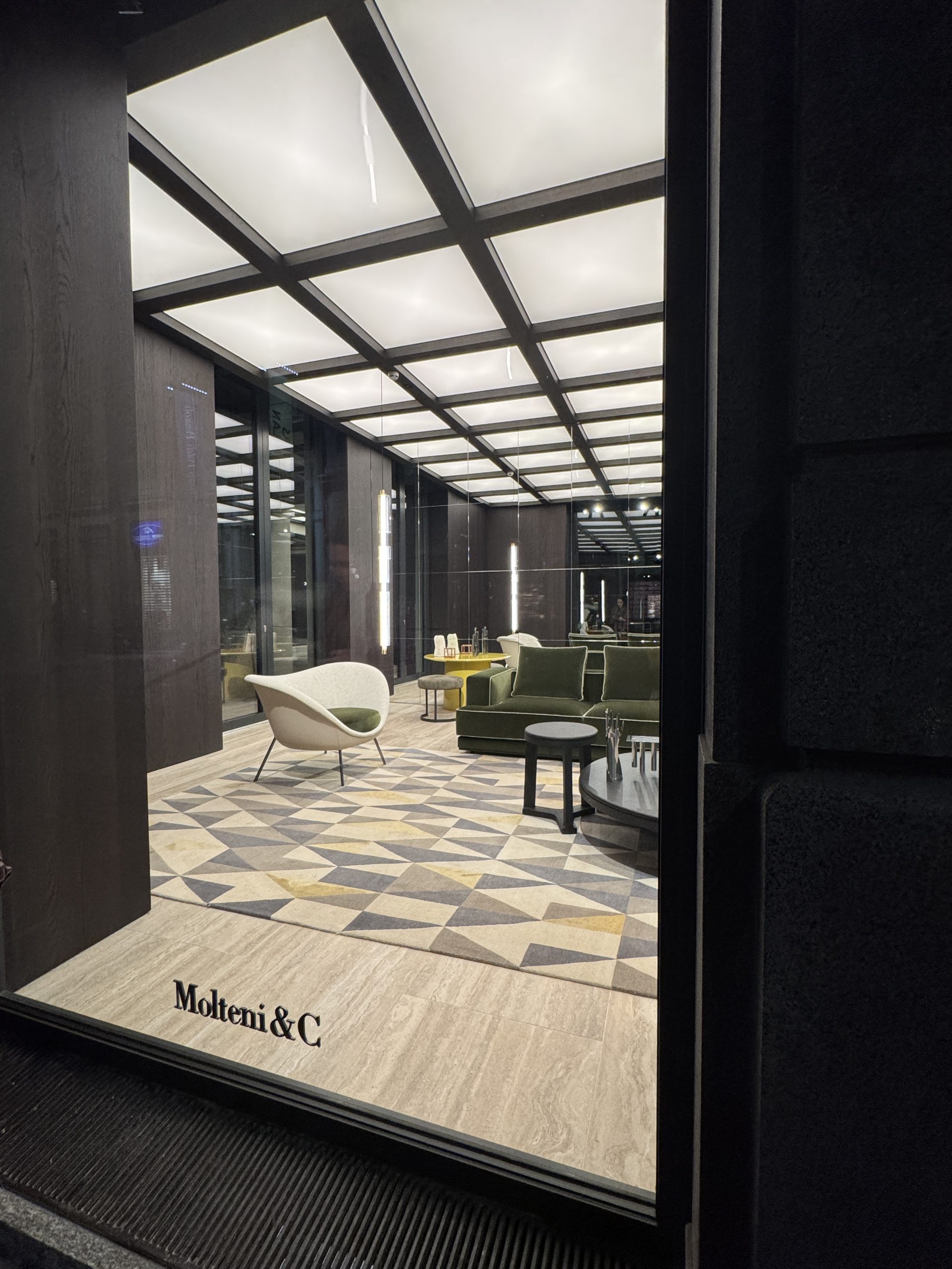 エントランスは2手に分かれ、アイコニックモデルであるキッチンが展示。もう一方にはモルテーニのシグネチャーとなるジオ・ポンティの家具が展示してある。2つのウィンドウで強烈なアイデンティティを表現している。このウィンドウは夜に見ると綺麗なので、後日夜にもその前を通ってみた。