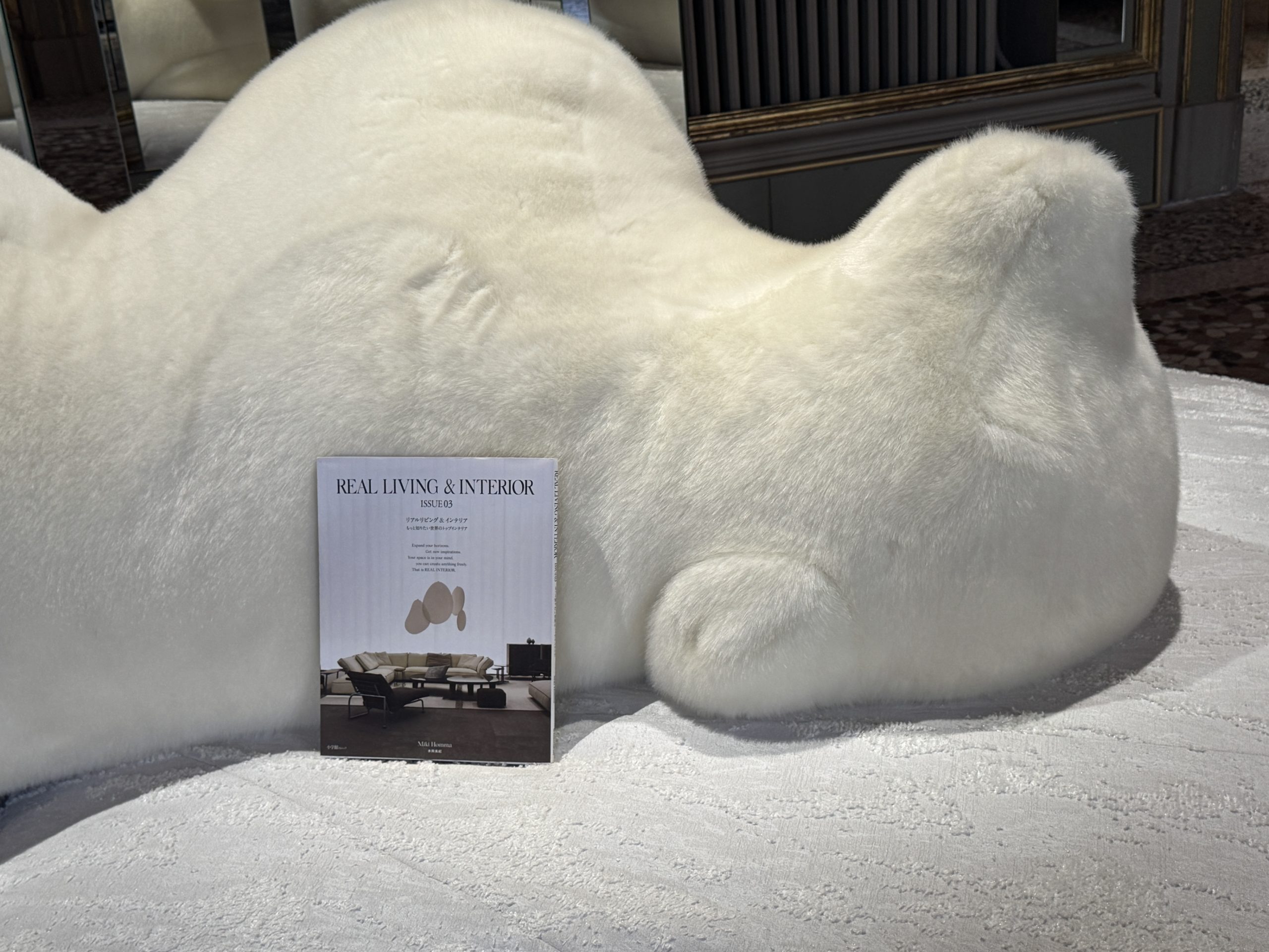 一見ユーモラスに見えるシロクマののったソファの意味はこちらのコラムで書いている。深い意味を持つソファ。「リアルリビング&インテリア」にも優しく寄り添ってくれる、、、、!