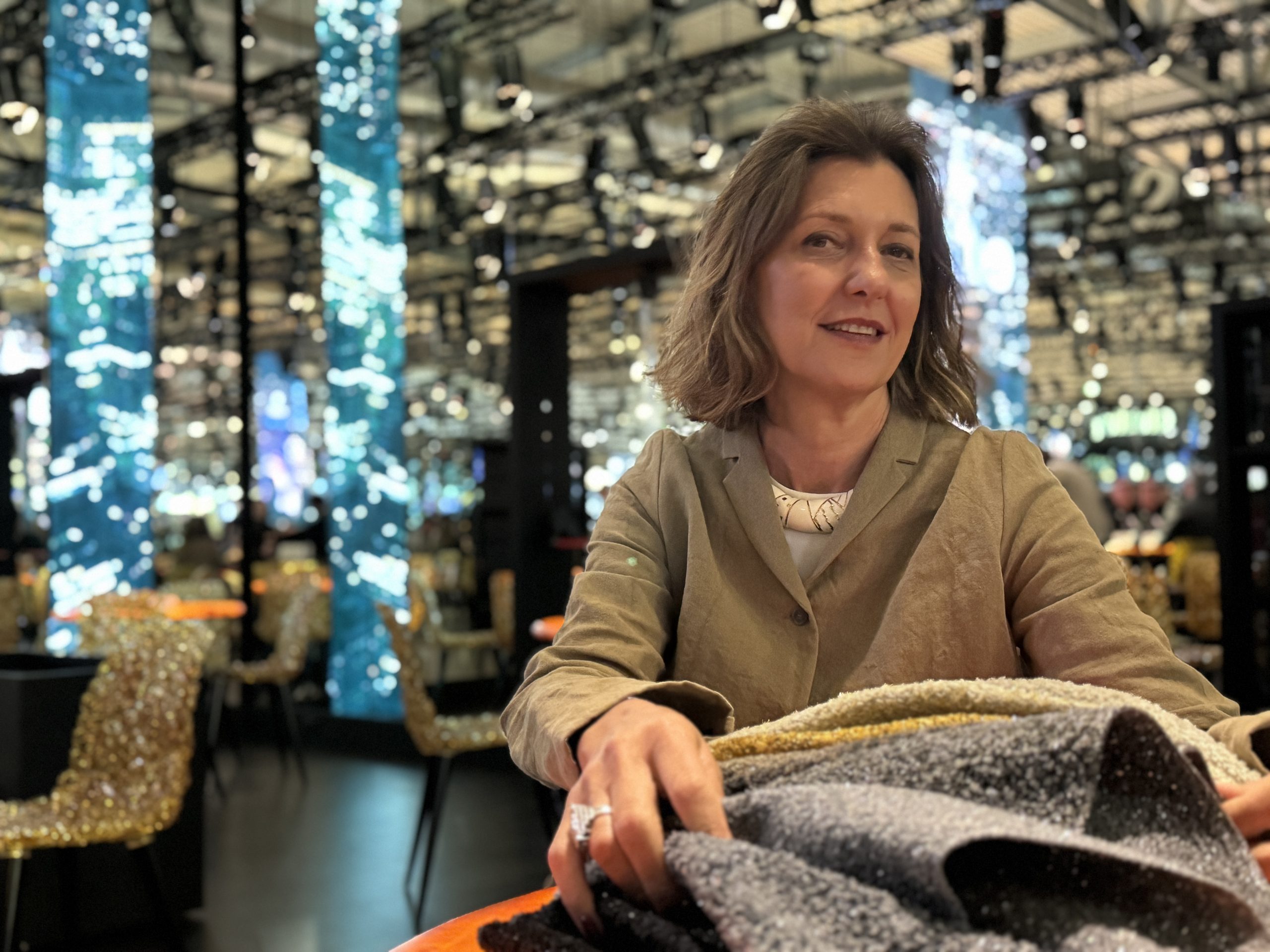 昨年、インタビューしたモニカ副社長が熱心に話してくれた輝く生地が実現したのだった(写真は昨年のもの、本当はサングラスをかけた姿がオフィシャルだけど、生地を手にして熱心に話す表情をスナップ)。