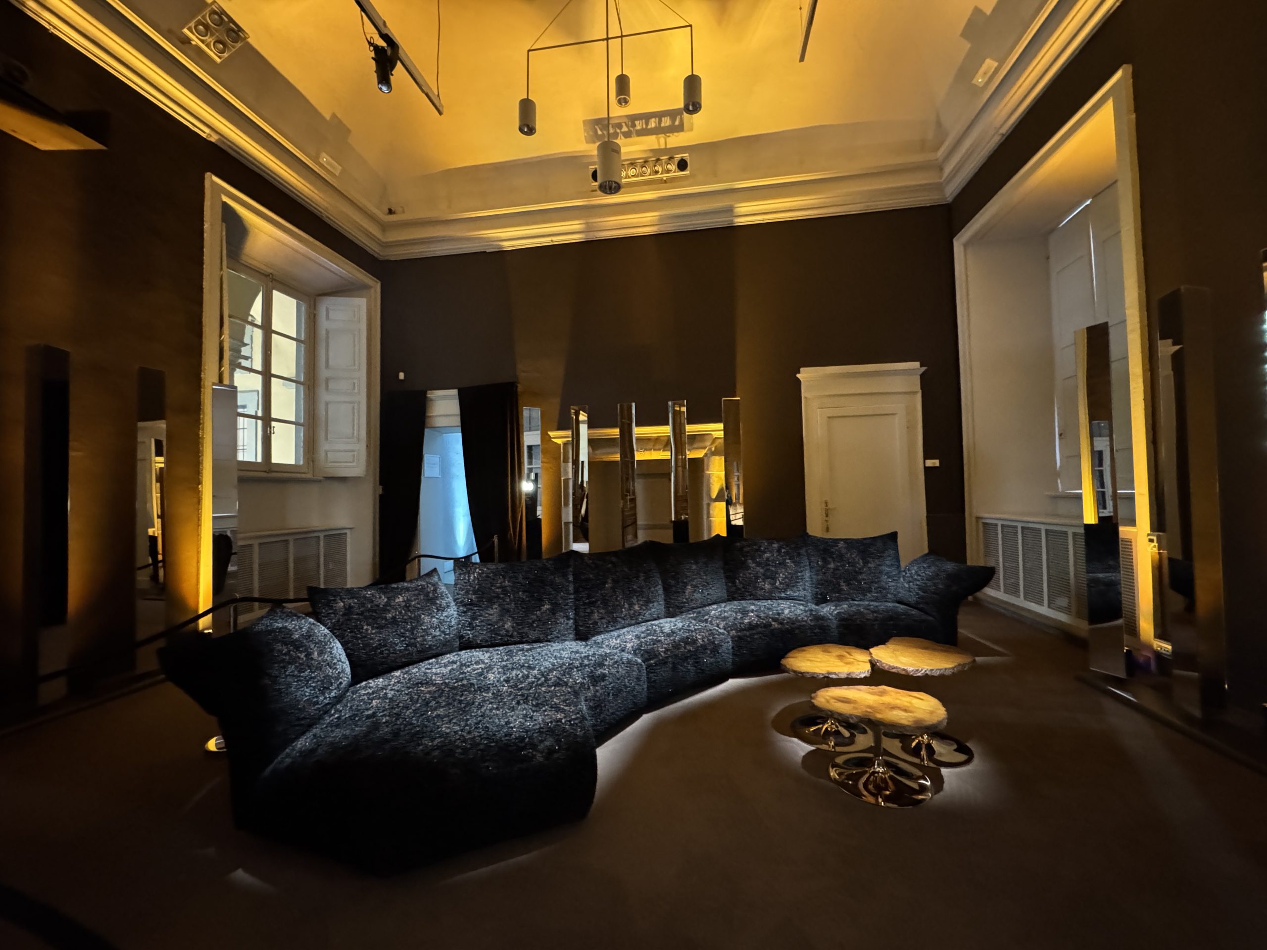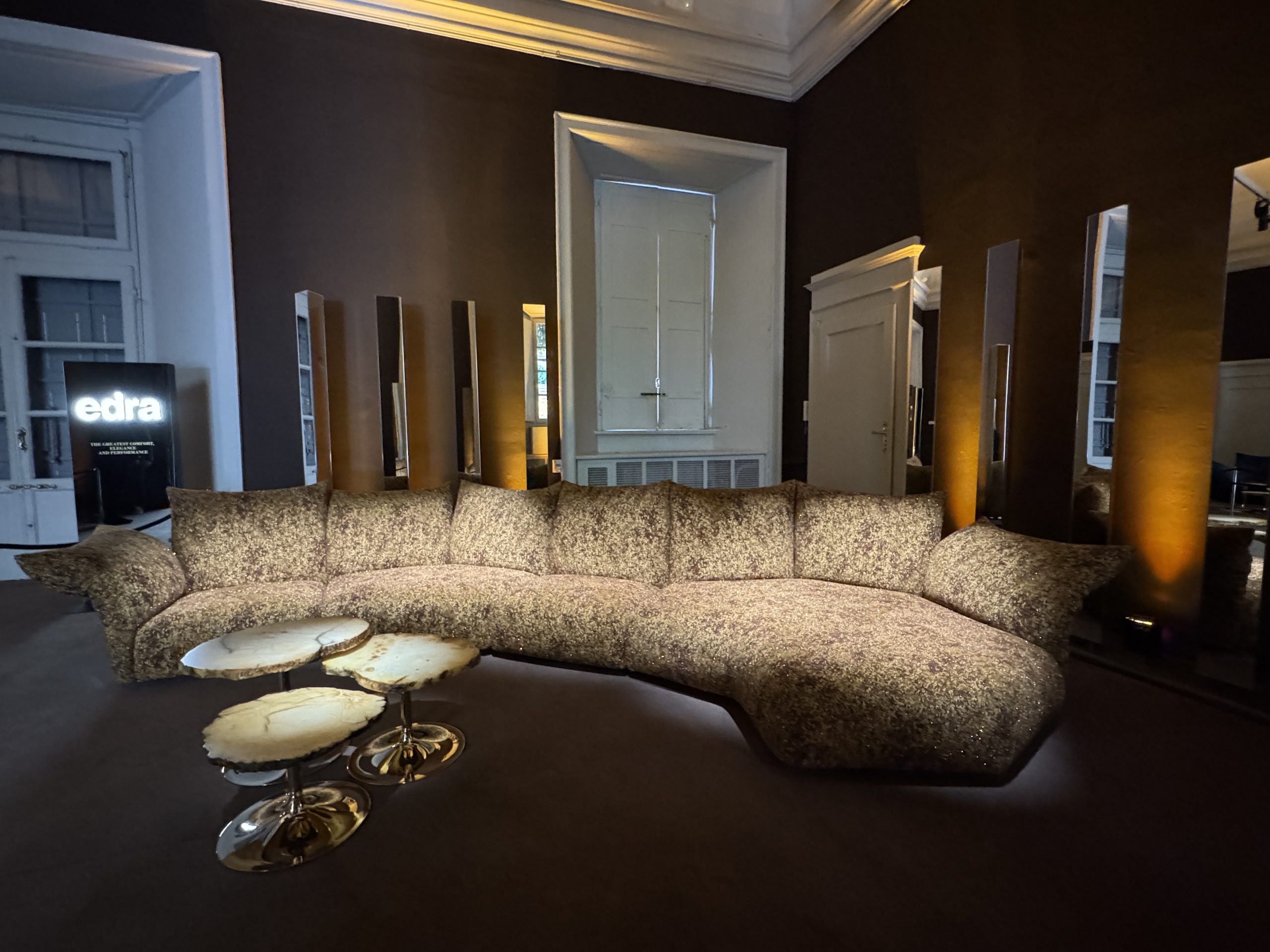 今年のエドラは家具としての新作は出していなかった。けれどもショールームに入ると、昨年も見ていた幾何学的なソファが神秘的な光をまとっていた。