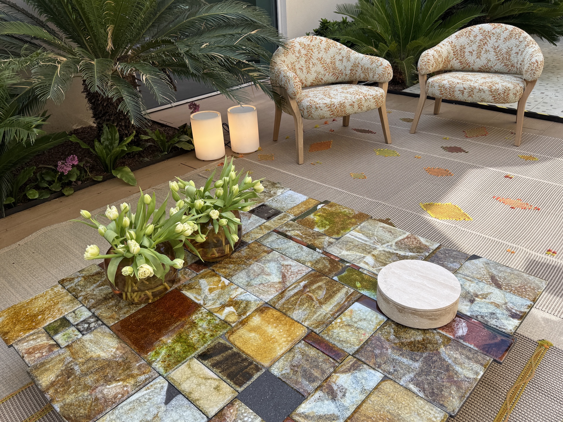 アップサイクルマテリアルの使い方が上手。デザイナーでありブランド名でもあるパオラ・レンティさんはマテリアルや色彩の使い方に天才的な能力を持っていて、すでに20年近く見続けているけど、毎年驚いてしまう。尽きない情熱、枯れない才能をもっている。タイルやガラスの工房からでるカケラや廃材をこんなテーブルにしてしまう。