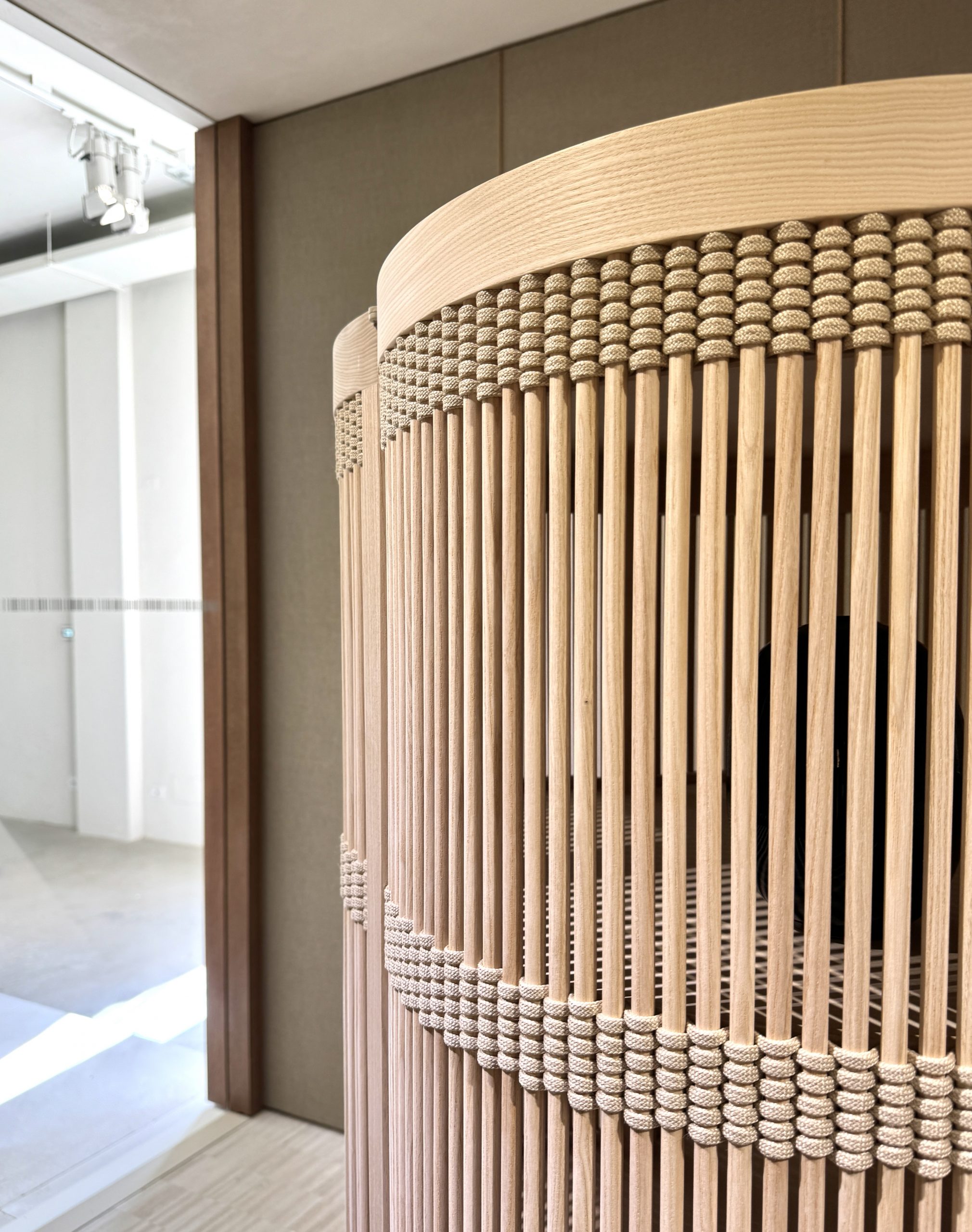 アッシュ材で編まれたタワーキャビネットは扉が閉じている時は、一体これがなんなのか?わからなかった。ミケーレ・デ・ルッキ率いるADLMがデザインしたもので、細いアッシュ材を日本のすだれ(向きが違うけど)並べて編んだロープ材でつながれている。ロープ材はパオラ・レンティのアイコニックな材料で、色彩を抑えても個性的で、素材の声が聞こえるようなものができる。