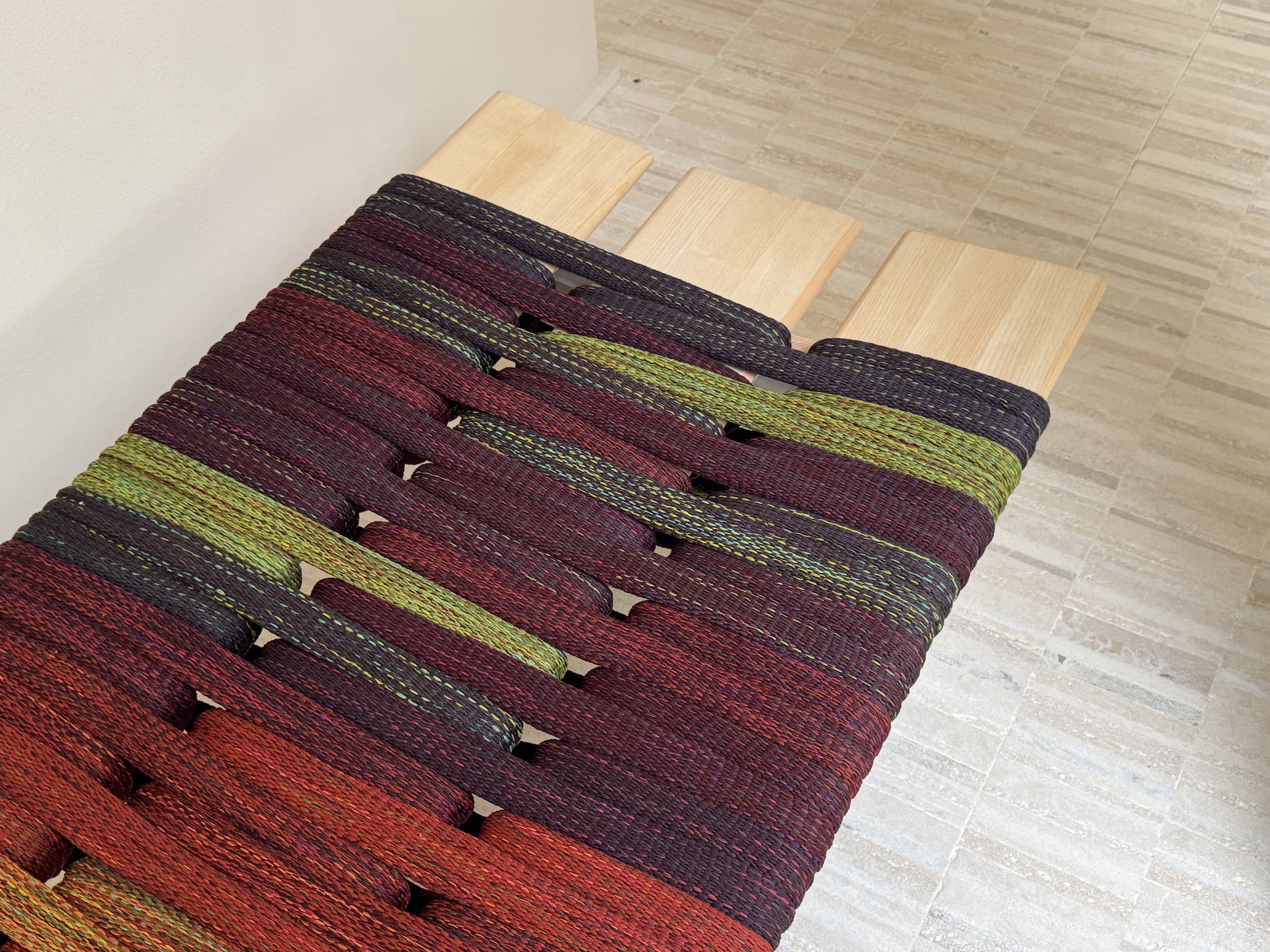 このベンチもすごい。まず太いテキスタイルのベルトを巻くことで、材がつながり、座面としての快適性を確保している。機能面がきちんと確保されている。それでいてラフに編んだようなベルト材の表情、そう見えて本当はきちんと計算して巻かれているのだとおもう。そしてボルドーとライトグリーンが微妙に混ざり合うような、色のグラデーション。