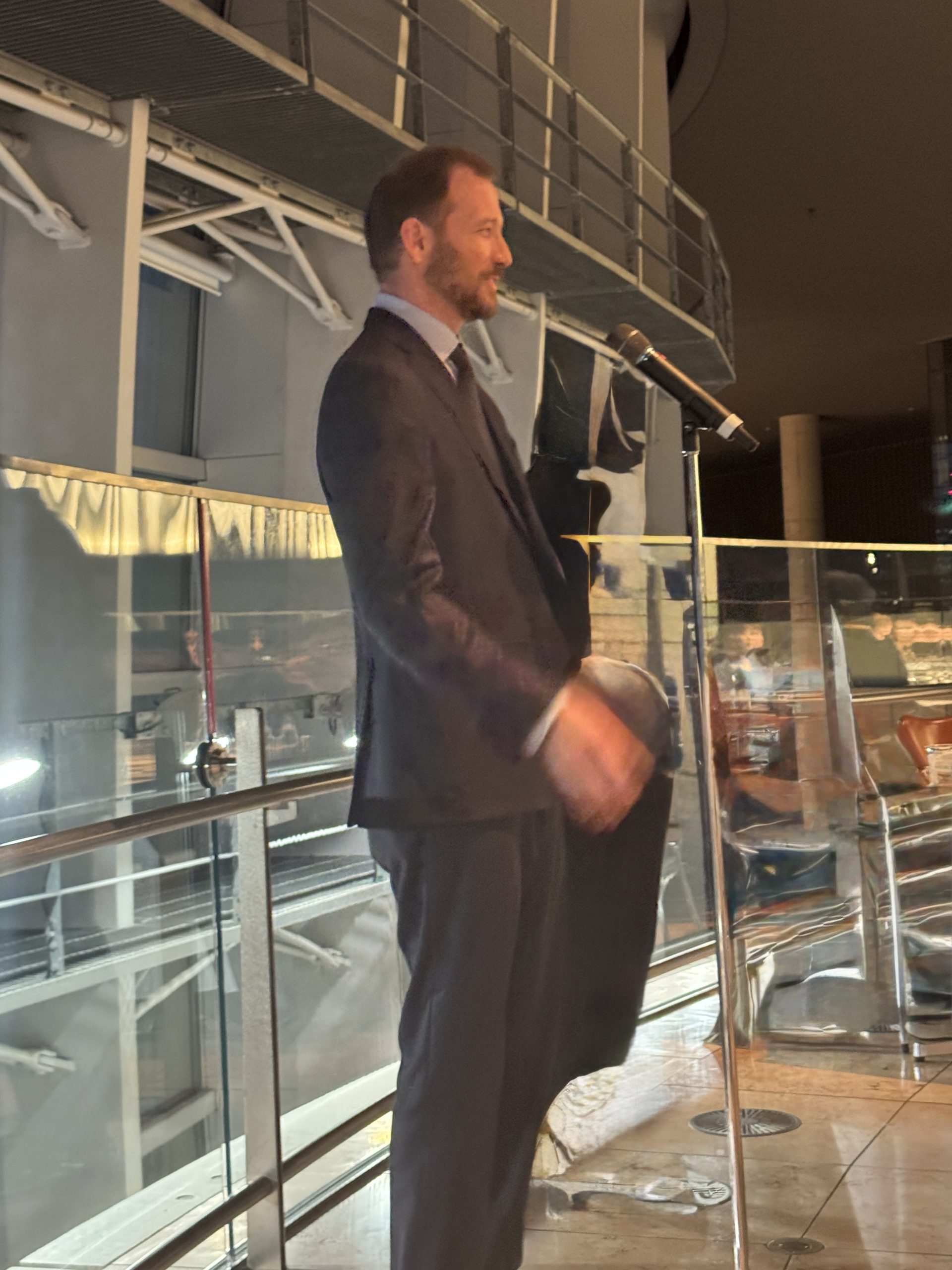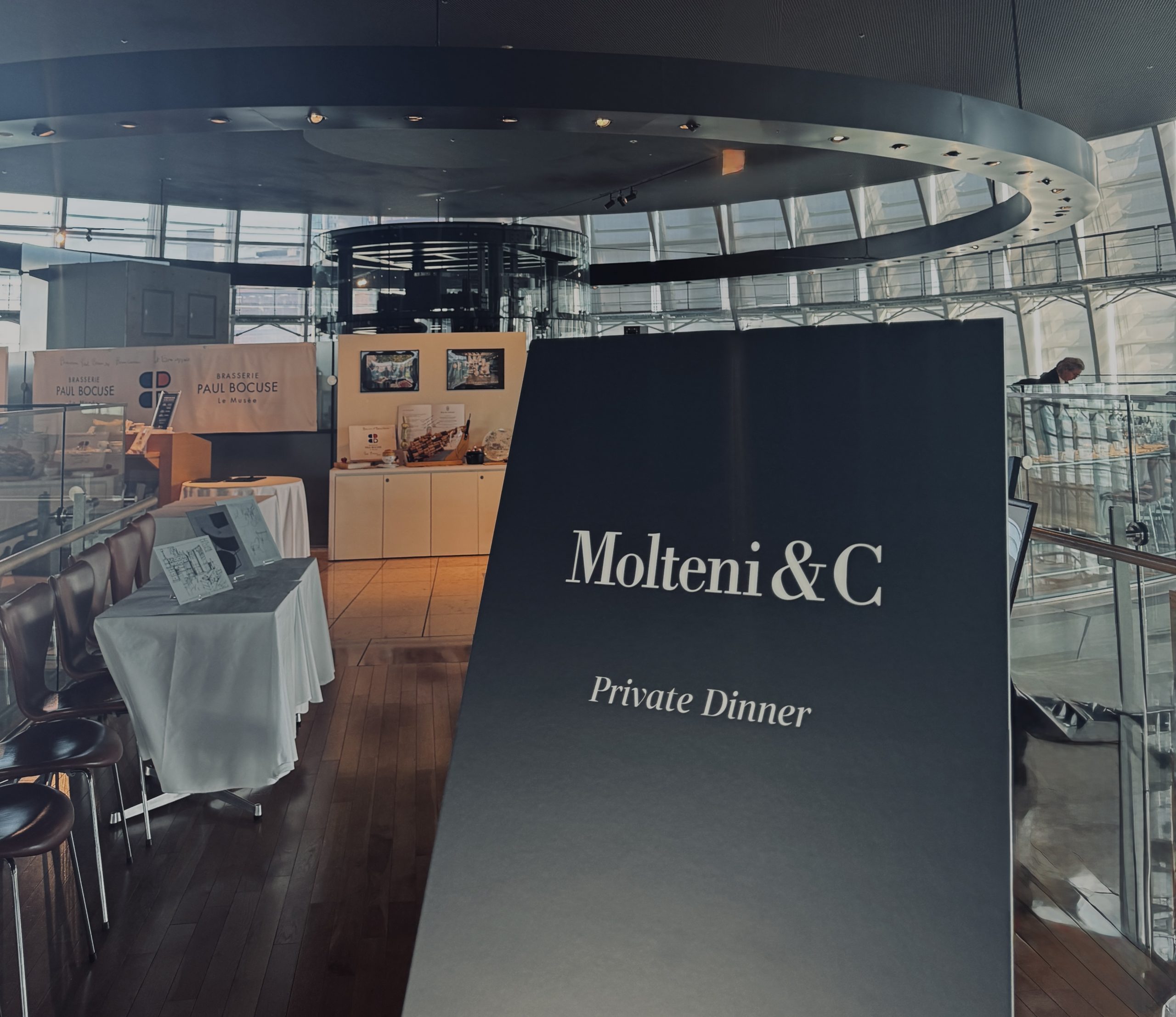 モルテーニ副社長氏からのスピーチ。自分たちもミラノの一等地マンツォーニ通りにパラッツォ・モルテーニをオープンした報告、それに続いて東京がオープンした幸運とモルテーニを日本で取り扱うアルフレックスジャパンへの賛辞が送られた。