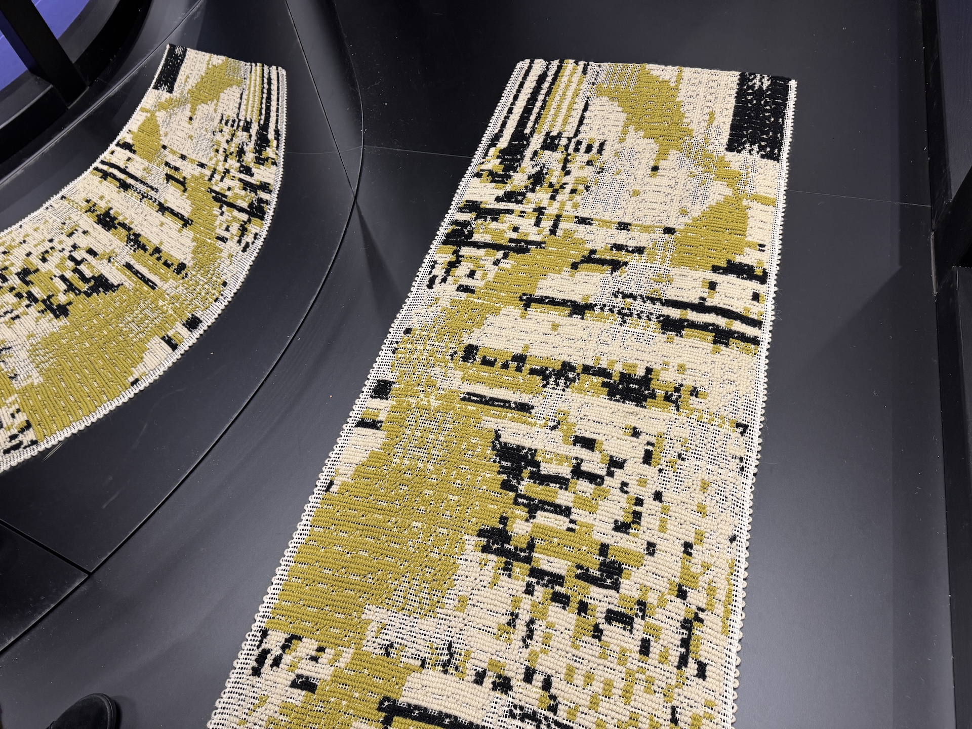 「AI生成の色彩や造形と、自然素材・ハンドクラフトの質感が交錯する、新しいテキスタイルの時代を描き出す内容となる」とアルコーヴァは発表しています。たとえば雨の音や鳥の声の音域をAIが解析し、グラフィックのパターンとして解釈する。それを人間の工芸技術で再現したテキスタイルなど、デザインという頭脳ワークとも手仕事(クラフト)を「動詞」という行為と考えています。