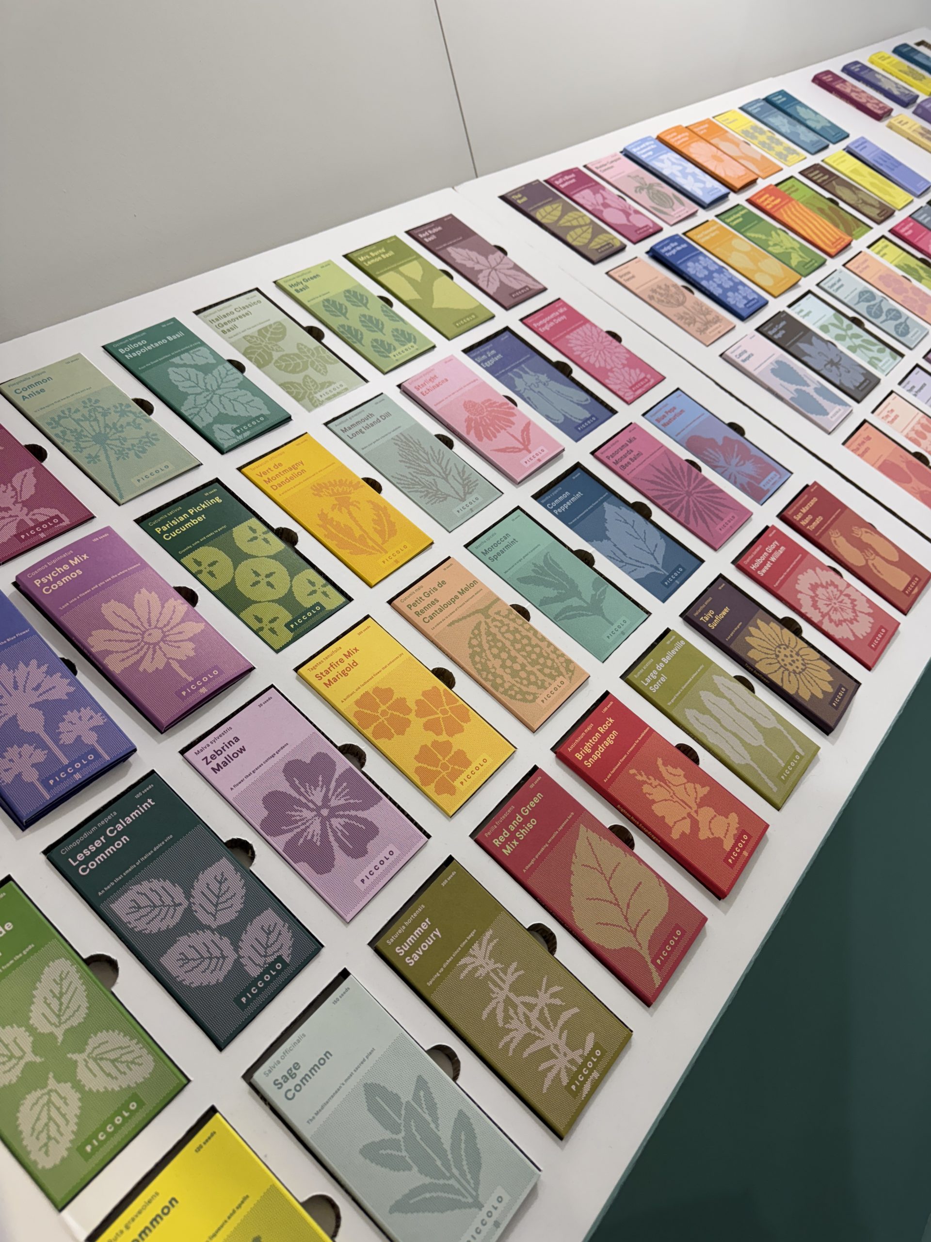 たとえばこちら。美しい絵本のような、チョコレートのようなグラフィックが並びます。これはなんと「タネ」!イタリアの「ピッコロ」という会社が提案する「ガーデンアルファベット」というコンセプトプロダクトです。